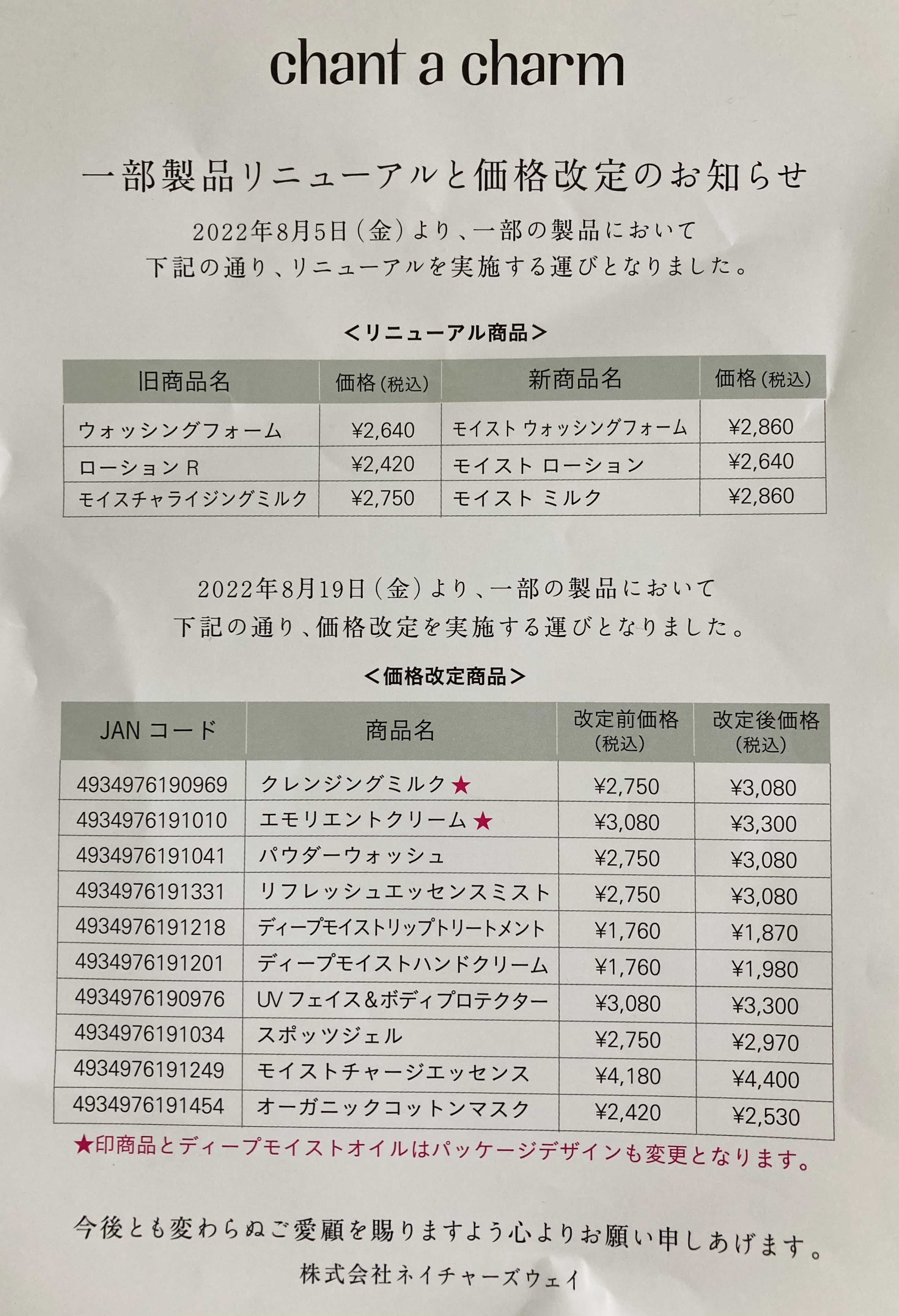 チャントアチャームが8月から一部製品リニューアルと価格改定するそうです🥹↓詳細ですリピ買いしまくっているローションRはリニューアルしてモイストローションとして生まれ変わるみたいです。価格も若干あがってる🥹愛用しているパウダーウォッシュも値上がりだ🥹ただ毎月買ってる炭酸ムースセラムの値上げがなくてよかった🥺✨✨あがり続ける物価💴とまらない円安💰上がらない給料🤪受け入れるしかない状況🫠ははははははは( ◠‿◠ )チャントアチャームはオーガニックブランドではとても手にとりやすい金額なので、これからもお世話になります🥹✨