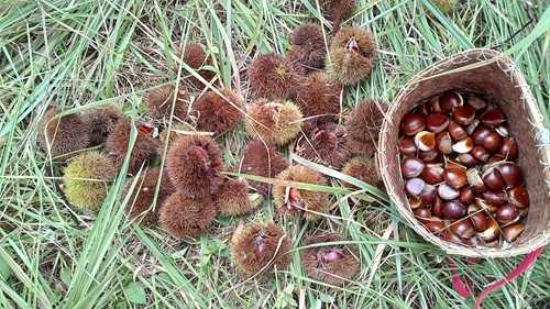 腹から胸の高さに伸びた雑草を刈り払い栗拾いした。