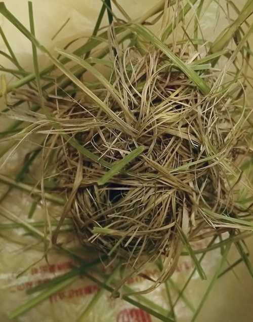 刈り払ってしまった巣を調べてみると空っぽだ。入口はあるがめちゃくちゃ小さい。小鳥は入れない。やっぱりカヤネズミだ。