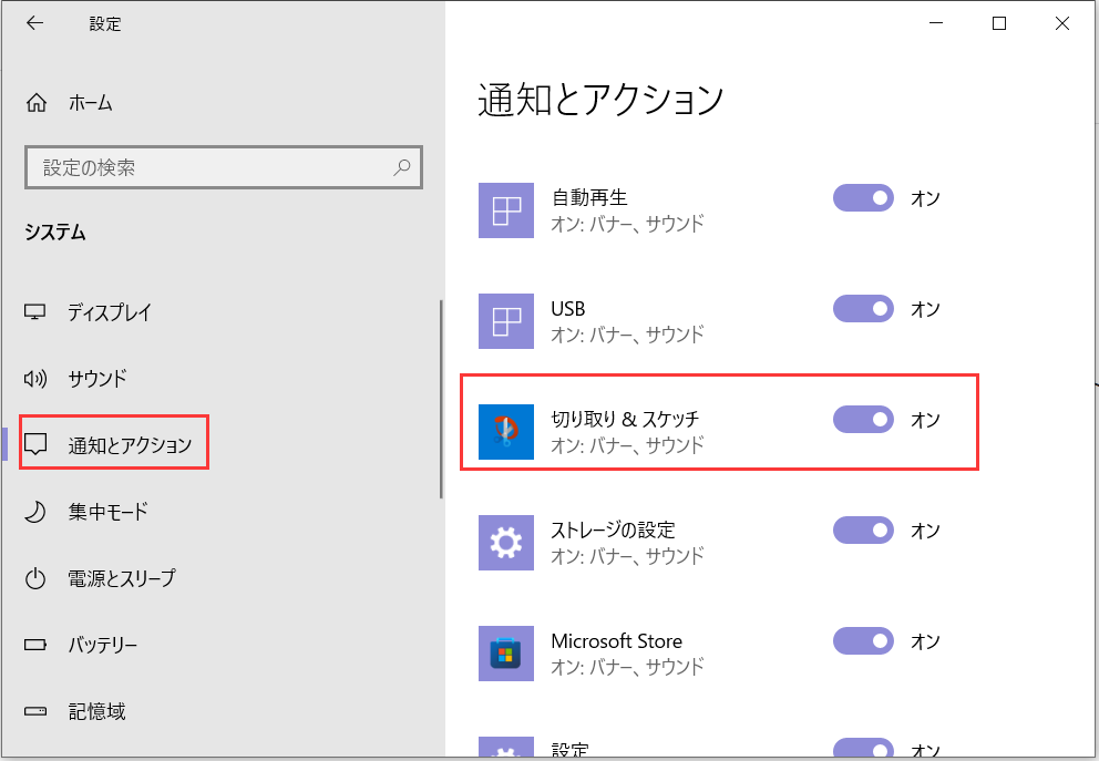 切り取り&スケッチが無効になっていることが原因で、​ Windows+Shift+Sキーが使えない ​場合もあります。切り取り&スケッチをオンにするには、以下のように操作してください。
