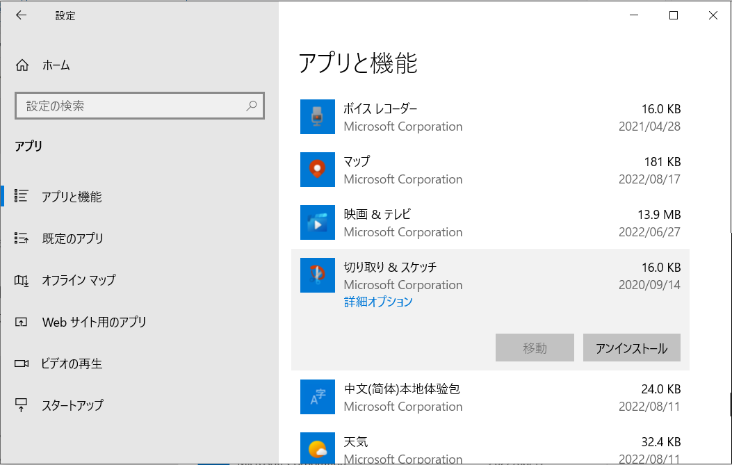 ステップ2.「アプリと機能」をクリックして、右側のメニューに下へスクロールして、「切り取り&スケッチ」をクリックして、「アンインストール」をクリックします。