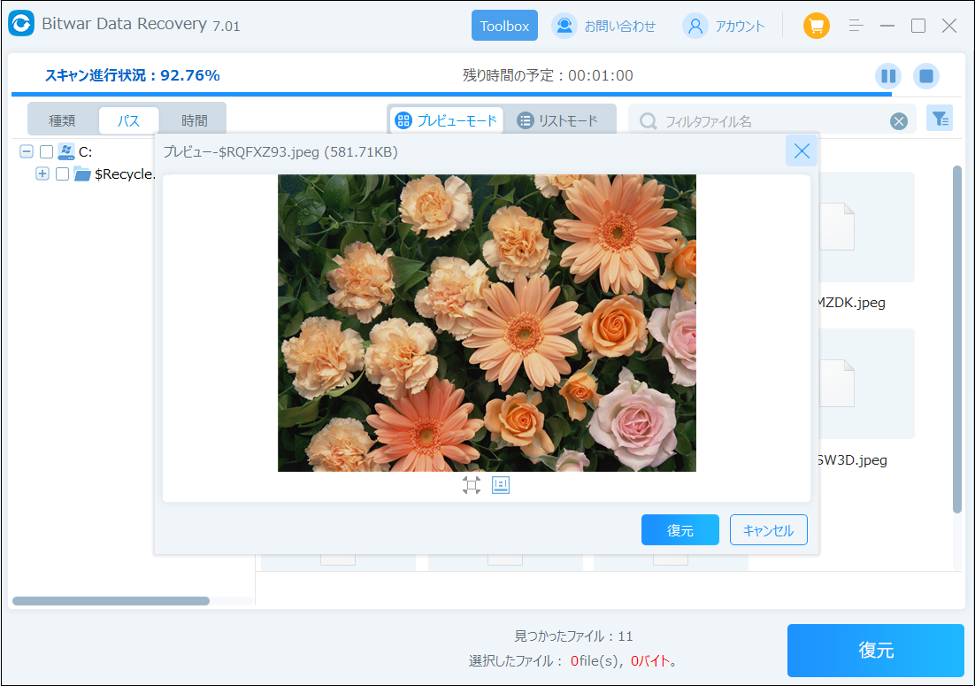検出されたデータをダブルクリックしてプレビューすることができます。「復元」をクリックしてデータを他のディスクに復元します。ファイルを上書きしないように、復元したいファイルを元場所と異なるディスクに復元する必要があるのでここで注意してください。