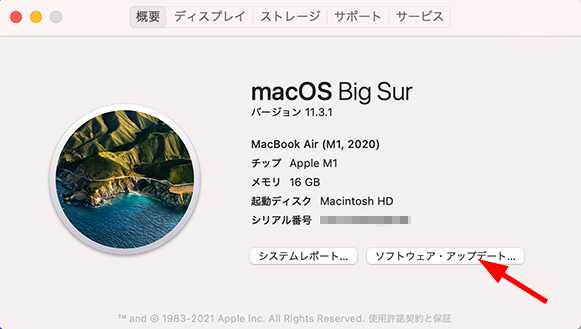 システムの不具合はソフトウェアのアップデートを実行することで解決できる可能性があります。macOSを最新の状態に更新してみます。