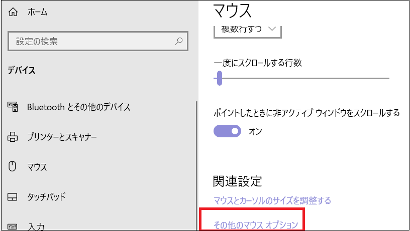 2.右サイドバーの[そのほかのマウスオプション]をクリックします。表示されない場合は、「設定」ウィンドウを水平にドラッグして幅を広げてください。