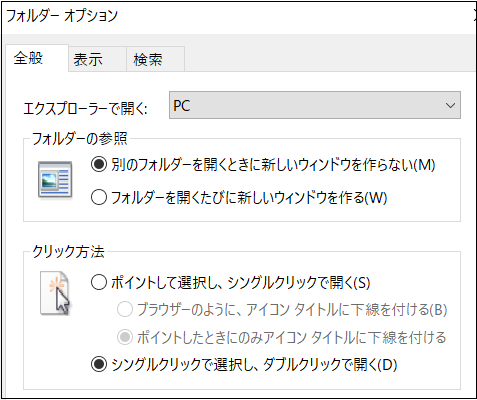 この中で、既定の動作は、「シングルクリックで選択し、ダブルクリックで開く」です。「ポイントして選択し、シングルクリックで開く」が選択されていれば、エクスプローラーで項目を選択するためにダブルクリックする必要はありません。この設定では、フォルダやファイルにカーソルを合わせるだけで選択されるため、フォルダーを開くのに一度だけクリックする必要があります。