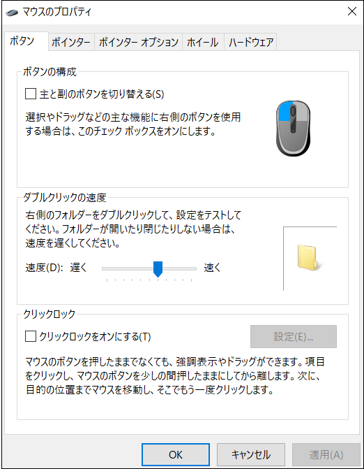 3.これをクリックすると、新しい「マウスのプロパティ」ウィンドウが表示されます。その中の「ボタン」タブに、「ダブルクリックの速度」のオプションがあります。