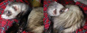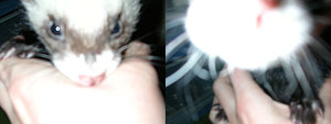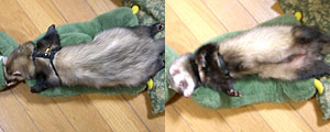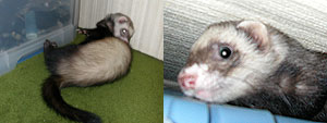 今日は家族で甲府までフェレットを見に行ってきました(^▽^*)3匹のマーシャルフェレットと1匹お店で飼っているパスバレーのフェレちゃんがいました。実はわたし、もにゃか以外のフェレットを抱っこした事がなかったのですが、お店の人のご好意でパスバレーのフェレちゃんを抱っこする事に!!ビックリな事に、まだ2歳というそのフェレちゃんは3歳半のもにゃかよりもずっと大きくて(倍ぐらい?)毛並みも全然硬いのです!!(常識?)心配になってお店の人に聞いてみたら個体によって大きさも毛並みも違うと聞かされチョッと一安心。フェレにも色んな子がいるんだなぁ~と思いましたそうそう!我が家のもにゃかはマーシャルフェレットなのにタトゥーが無いんです!!しかも臭腺の手術が不完全だったため生後約半年で再手術(><。)でも全額マーシャルで保障してくれたし幸い大事にも至らなかったので良かったのですがお腹とお尻の毛がゴッソリ剃られてしまい哀れな姿でした(*>_