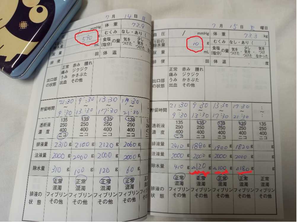 ハイブリッド化 ※「ハイブリッド」腹膜透析と血液透析を併用した透析方法。を目指して、現在休眠中の「腹膜透析」の機能を見定めるべく先週から入院をしております。結論は、「否」となりました。わかりやすく会社に例えて説明すると★1日「売上-経費」で粗利益1000万円を確保せねばならぬ企業で★それまで、「総務・経理」を一人で担ってきた「腹膜くん」に★「営業」一筋65年!の「大黒柱:腎臓くん」がほとんど動けなくなったので★「腹膜くん」が、全くの素人で有りながら、たまたま「腎臓くん」の役割ができそうなだけで★今までの「総務・経理」は当然そのまま一人で切り盛りしつつ★更に「腎臓くん」の独り舞台であった「営業」もフル稼働するよう (しかも、大黒柱/エースとして)命ぜられるが、★元来「ど素人」であり、今までの仕事も手を抜けぬ故、遂には、 昨年末に「原因不明」のまま、瀕死の状態になり★しばらくは、病み上がりながら元の「総務・経理」だけはフル稼働し 「腎臓くん」の仕事は外部委託(シャント造設による血液透析)で賄う。 これがないと企業は成り立たない。 ★何とか頑張っては来たものの、結果、新たに「シャント」という外部委託による 経費(リスク)が増加してしまった。★外部委託による経費増加を最小限に抑えるべく、再度休眠中の (休眠とは言え、本来の「総務・経理」は一人でフル稼働中) 「腹膜くん」にもう一度「腎臓くん」の代わりをできいないか? を探る為の入院です。 外部委託(シャントによる血液透析)を最小限(週1回~2週に1回)に 抑え、残りを血管に負担がかからない「腹膜透析」にする。⇒ハイブリッド これにより、「腹膜透析100%」「血液透析100%」よりも、それぞれ 負担が軽減され、血管も腹膜も寿命が延びる・・・との目論見が。。。★今回の入院の結果は、 目標粗利益:1日1000万円のところ 初日:980万円 2日:780万円 3日:490万円 4日:590万円・・・と、目標には届かないものの「プラス」で推移してきましたが、 5日:わずか10万円これでは、数百人の社員は食わせていけません。 赤下線部は、「粗利益ベース」ですら赤字!体重も入院当初より増加!朝一には、良いペースであったものの日毎に鈍化していた数値はいよいよ「マイナス」に転じ、この粗利益ではここから販管費などを計上すると日のトータルは完全に「マイナス」となってしまいます。この「マイナス」分は、腎臓くんが機能しない状態ではそのまま体重増加に繋がり、これは、即ち「過剰水分=むくみ」となり果ては、昨年末と同じように肺や心臓に波及して「ほぼ溺死体」に近づくわけです。「腹膜くん」には、いつでも「腎臓くん」の代わりに仕事ができるよう大規模な「改造手術(腹膜カテーテル)」を施し、あたかも「サイボーグ戦士」の如き様相を呈しているのですが、ひとたび「腹膜透析が機能不全」となると本来密閉空間であった「腹膜」内に無理やり管を通しているのでこのカテーテルはもはや「無用の長物」どころか、ウィルス付着の最前線基地となり、腹膜炎のリスクがめちゃんこ高いのです。一昨年の7月に「腹膜カテーテル留置手術」を行って今月でちょうど2年・・・来月か再来月あたりに、今度は、「カテーテル抜去」の手術のため10日ほど入院することになりそうです。当初は、「何とか10年・・・少なくとも5年は腹膜で・・・」と期待していたのですが、こればかりは仕方がありません。こんな状況の中で、社員の「夏のボーナス」を今日、振り込みました。昨年末も病室から瀕死の序受胎でネットバンキングで送金しましたが、今回は、事前準備をしてからの入院でしたので事務作業はスムーズに完結しました。前回も、今回もまた借り入れをして、のボーナス支給です。年金が2か月に1度「雀の涙」ほど出るのと、「入院・手術」で保険会社3社から出る保険金とを今回の借り入れの返済予定の一部に組み込んでいます。まさに、「身を削って社員に給与・賞与を出す」(TへT)今年の暮れのボーナス時には、もう入院も手術もしなくて済むよう何とか「黒字とは言わん!せめてトントン」に!「腹膜くん」と「腎臓くん」の例え話をしたつもりがそのまま、現実の会社と同じ状況だった!PS:3社の内の1社の保険代理店をしている「M川」さんがお見舞いに来てくれました。「一番初めの保険金支払い ⇒「2017年12月3日」この期に及んで・・・今度は「心臓」(TへT) の時は、保険に入ってすぐやったから、 本社から、詐欺か!との疑惑を受けたが、 その後は、ギリギリのところでクリアしてる。」との事。ギリギリ・・・なのね。。。ま、ここんとこ毎年、だからねぇ。(-。-)