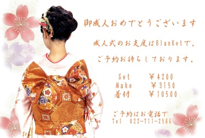 成人を迎える皆さんおめでとうございますセット、メイク、着付のご予約はお済ですか?ブランケットスタッフ一同、皆さんの記念日を盛り上げて心に残る素敵な日になるようにお手伝いさせて頂きたいと思ってますご予約はお早めに・・・。