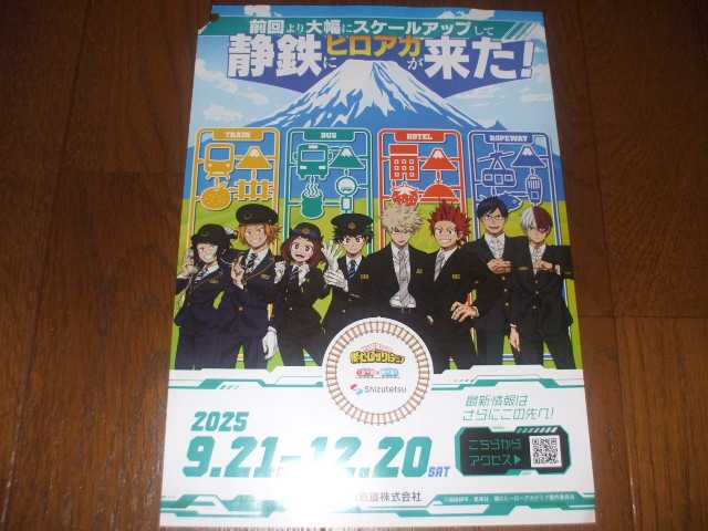 アニメ『僕のヒーローアカデミア』と静岡鉄道とのコラボ、第二弾ですよ~。2024年にコラボした時は、新静岡駅にパネルを撮影しに行ったり、グッズを買いに行きました。今回のコラボは、前回より大幅にスケールアップしているとのことで、期待大です。コラボ期間は、2025年9月21日~12月20日の約3ヶ月間。詳細は分からないのですが、ヒロアカのラッピング電車が走行するのは、間違いなさそうですね。果たして今度は、どんなグッズが販売されるのかなー。↑静鉄バスに備え付けられたチラシを、母が取ってきてくれました。写真の画質が荒いのは、デジカメのせいです。エコノミーモードで、撮影しているから。画質を良くすることも可能ですが、重くなっちゃうんですよね。今回のメンバーには、梅雨ちゃんがいないんですねー。代わりに、上鳴くんと耳郎ちゃんがいました。かっちゃんの制服姿、今回もカッコ良いです~。(*´ω`*)前回のコラボでは車内放送に、緑谷くんの声優さんが、声を当てられていました。…と言うことは。今回こそ、爆豪勝己の声優・岡本信彦さんに、車内放送をして貰いたいっ!!岡本さんのお声で、「新静岡~」とか「長沼~」とか、是非とも聞いてみたいです。それぞれのラッピング電車で、各キャラの声が聞けたら、最高なんですけどね。前回よりスケールアップしているのなら、これくらいはやって欲しいですよー。TVアニメ『僕のヒーローアカデミア』(2026年1月始まりカレンダー)静鉄のコラボとは関係ないんですけど、ヒロアカの2026年カレンダーが予約注文受付中です。昔は好きなアニメのカレンダーを、よく購入していたものですが、最近は…と言うと。毎年100円ショップの「くまモンカレンダー」で、済ませています。アニメも最終決戦に突入するみたいだし、来年くらいは…とも思いましたが、やっぱり高い。来年も「くまモンカレンダー」に、お世話になるかなー。あはは。とにもかくにも、ヒロアカと静鉄のコラボ第二弾、楽しみです。↑人気ブログランキング当サイトは、ブログのランキングに、参加しています。