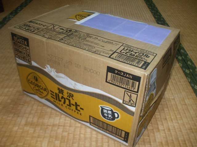 お買い物マラソンで購入した、数々の商品を紹介していきます。ジョージアの「贅沢ミルクコーヒー【500ml】」を飲みました。楽天市場で購入したので、24本入りの箱買いです。クーポンが利用できたので、表示されている価格より、お安く購入することが出来ました。普段なら、買うことのない価格帯なんですけど、クーポン適用で少し安くなったので、ラッキー。牛のマークが目印、なめらかでコクのあるカフェオレです。飲んでみる前までは、マックスコーヒーのような甘さのある、カフェオレだと思っていました。個人的な感想ですが、ちょっとだけ癖のある感じがしましたねー。コーヒーの苦味が、少しだけあると言うか…普通ではないな、と思いました。甘さが際立つ、カフェオレを想像していたので、意外でした。「コーヒーはブラックで飲む!」という方にとっては、飲みやすいかも知れません。ジョージア 贅沢ミルクコーヒー PET(500ml×24本入)【ジョージア】↑こちらのショップで、購入しました。普段は値段が高く、手が出しづらいのですが、クーポンを利用することが出来れば、1本税込100円くらいで買えます。真夏の水分補給には、少し糖分が気になるところです。あまり飲み過ぎないように、2日に1本くらいのペースで、消費していこうと思います。↑人気ブログランキング当サイトは、ブログのランキングに、参加しています。