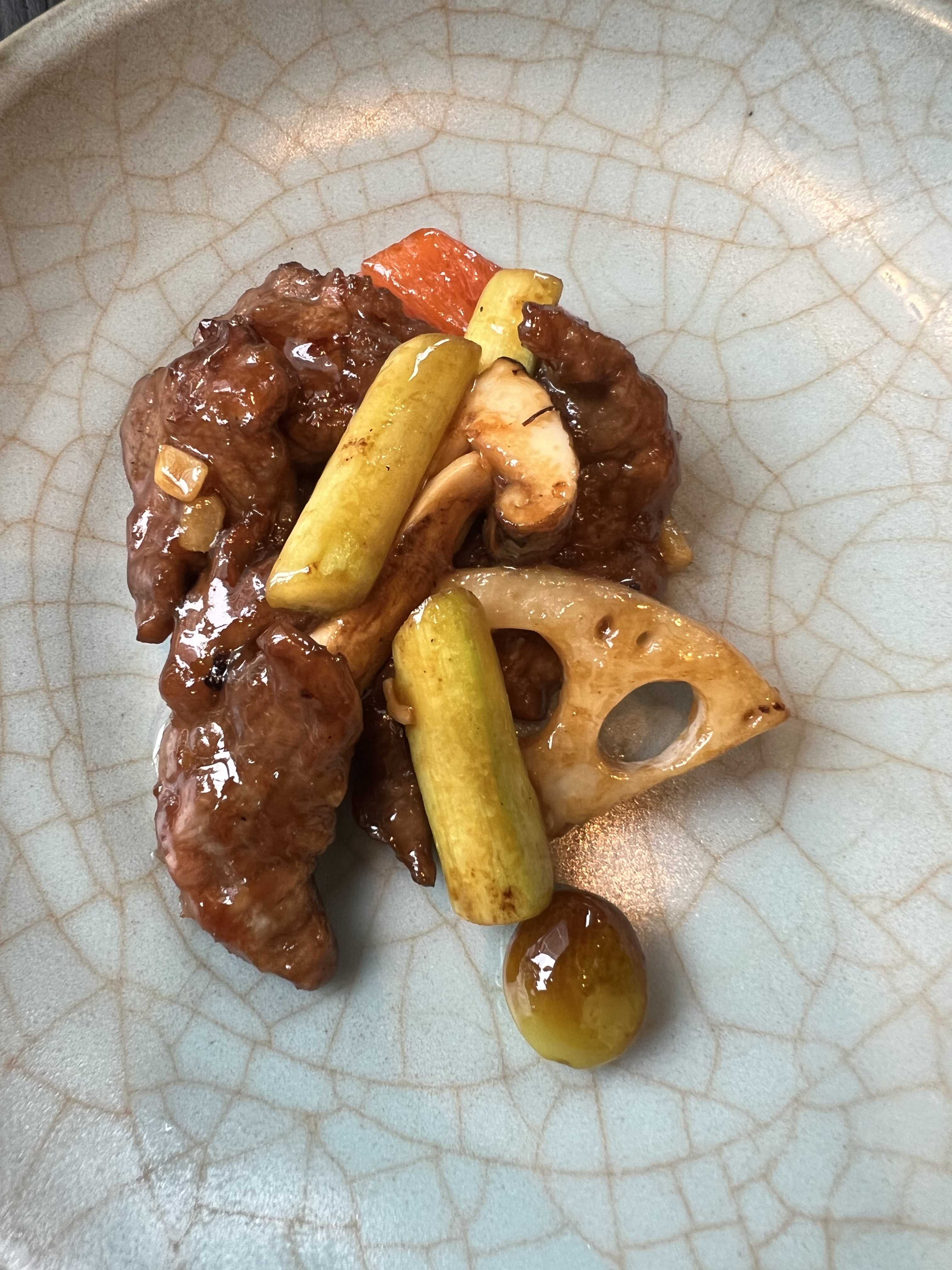 ⏬松茸と牛肉の炒め2.えびちり、3 ファンサラダ