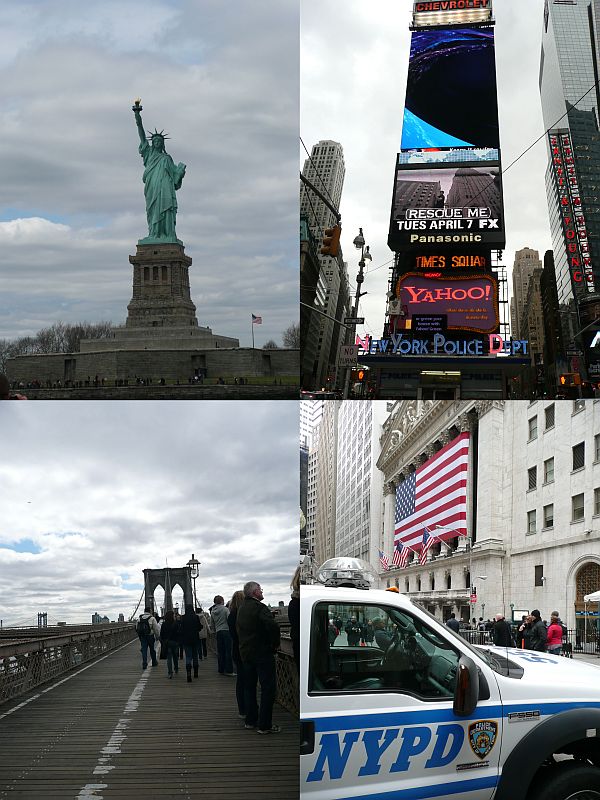 今はNYに来て2日目の夜を迎えています!現在の時刻は~夜の10時過ぎ、時差は約13時間日本に比べて遅いんですね♪気温は、北海道と同じ位?!最高気温も約10℃以下と寒いのですが・・・思ったよりもニューヨーカーは薄着?!で歩いています。街を歩いても日本人らしき観光客は割と少ないほうかも???とりあえず・・・一般的な観光地を散策しました♪「自由の女神」と「タイムズスクエア」「ブルックリン橋」と「ウォール街」例の「グランドゼロ」は、新たに復興に向けて工事中でした!しかし、観光気分も今日まで?!です・・・明日からはメインの見学と恐怖?!のレポート書きが2日間に渡り待ち構えています!