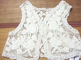 ジャッコランタンさんのコットンレースベストが届きました。こちらのベスト、980円でメール便可なんです!綿100%の優しい素材で、レースもとっても可愛い!繊細な刺繍ですが、結構丈夫そう?でしたよ。安っぽく見えないし、これ一枚着るだけで印象が変わりますね。アジアンチュニックに合わせて。相性バッチリですね!後ろはこんな感じです。モデルさんのように、ワンピースやTシャツに合わせても良さそうですね。前のチロリアンベストと使い分けして活躍したいと思います♪ナチュラルでガーリーな甘カワコーデにぴったり♪ボヘミアンにもフォークロアにもキマる優秀ア...価格:980円(税込、送料別)