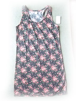 よろずやさんの花柄長めタンクトップが届きました。このタンクトップ、1,000円でメール便可能でした♪丈が81センチあるロング丈。色はブラックです。カットソーのインナーとして着て、裾からちょっと出して着たかったんです。柄は画像通りで、ブラックというよりはグレーですね。ただ、一つ残念だったのは、、、綿100%と表示してあり、タンクトップにも綿100%とタグがついているのですが、質感が、どう見てもポリエステルが入っているような質感なんです。今までの綿とは違うような。綿と記載されていたので買ったようなものなので、もし本当であっても、ちょっと想像していた質感とは違うので残念です。見てみると可愛いんですけどね。
