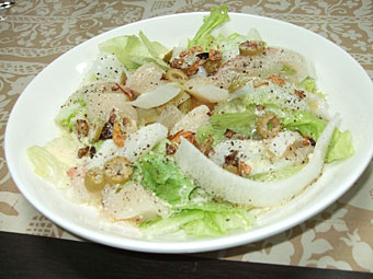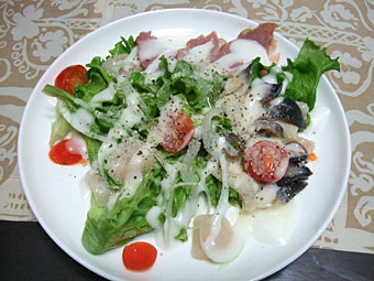 タコとホタテのカルパッチョ。カリカリに焼いたニンニクがアクセントになっておいしい!!主人特製のドレッシングで頂きました。おいしかったよ~ありがとう!!!つわりがおさまってから、食べまくりの毎日・・・当然体重も増えてきて・・・栄養管理もしなきゃ~~~と最近は野菜中心に切り替えました。だけど、お腹の子が男の子だとこってり系のものが食べたくなることが多いんだとか。。。!!!まさに私・・・今までさっぱり系や和食中心だったのに、ハンバーグやとんかつなど、パンチのきいたものが食べたくなります。不思議ですよね。人間の体って、こんなに変化するんだ。身をもって実感してます