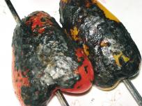 自然がくれた鮮やかな色のパプリカを真っ黒けに焦がすのは、勿体無いような気がしてなりません。皮を剥く為に直火で表面を真っ黒けに焦がしたパプリカは紙袋に入れて蒸らします。 拘りの紙袋も枝豆色、数分間蒸らすと黒焦げた皮が剥け甘さが増すようです。普段はサラダやマリネにしてますが、再度スペインのピザ『コカ』の具として使ってみました。 ちょうど庭のブルーベリーもまた数個収穫できましたし、新たにブラウン・マッシュルームと桃も具として加わりました。