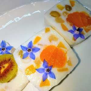 いつもご訪問ありがとうごさいます萌えっな断面を想像して再度 牛乳パック寒天を作りましたミニサイズの早生みかんとフルーツ缶断面に現れてませんがシャインマスカットも いますyo紫色のブドウも入っているのですがっ真ん中になるように竹串差しのレッドキウイ2個入り上手くいかないもんで隅っこ寄りボリジ亭のハーブ畑よりこぼれ種から開花のボリジを添えて祖父のお弟子さんから お土産で頂いていた懐かしい甘〜〜〜い豆腐カステラ豆腐カステラ風を焼いてみました焼き立ては伊達巻き風冷蔵庫で翌日は しっとり甘〜〜〜い お菓子