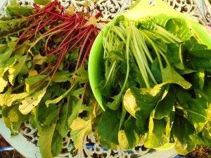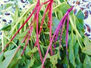 紫水菜と越冬しトウ立ち、花が咲きそうなスイスチャードも収穫
