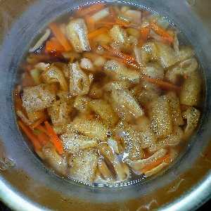 鶏モモ肉、干し椎茸、千切りゴボウ、ニンジン、お揚げさんにセリ