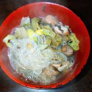 ​ 干し椎茸欠かせず鶏モモ肉、豚バラ肉、春雨、白菜1株
