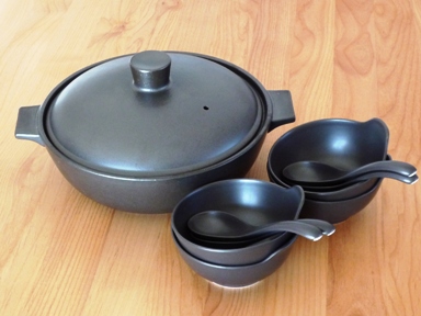 先日書いた卓上IHクッキングヒーターに合わせて買った土鍋セットが届きましたじゃじゃーん (効果音が古いと日常会話でよく言われます。。)IH土鍋 KAKOMI 2.5LIH対応の土鍋とお揃いの小物ですスタイリッシュだわ~お揃いの「とんすい」と「れんげ」は、楽天市場ではもう売切れてしまっていて買えなかったので、こちらにて購入しました。(3,150円以上購入で送料無料と良心的)この土鍋&小物は波佐見焼(はさみやき)の陶器です。波佐見焼というのは、長崎県の波佐見町で作られているもの。私は近年まで知りませんでしたが、あの有名な有田焼の佐賀県有田町のすぐ近くにある町で、陶器市のツアーは有田・波佐見がセットになったりしているくらい、九州ではメジャーな焼き物です。私は陶器好きなので実際に陶器市に何度か行ったことがあるのですが、有田焼よりも波佐見焼の方が好みのものが多いです色違いで白もありますよ。白もすごくカワイイ先日購入した、エレクトロラックスIH卓上クッキングヒーターと合わせた図。うむうむ。いい感じ実は、IH土鍋はすご~~くこれと迷いました。IH対応DONABE 卓上鍋 27cmどちらもスタイリッシュでステキなのですが、機能は一長一短で。。。まとめると、、、【KAKOMI】 ○本当の土鍋だから保温性がある ○大きさが、小さすぎず大きすぎずちょうどよい中間サイズ ○小物がセットで揃う ×お手入れが面倒そう(使ったら早めに洗えとかよく乾かせとか・・・) ×割れる心配がある ×IH対応の陶器は長年使用するとIHに反応しなくなることがあるらしい【DONABE】 ○土鍋風であってステンレス製なのでお手入れが簡単 ○割れる心配がない ○IHが効かなくなる心配がない ○サイズが豊富 ×本当の土鍋でないので保温性がない ×ステンレスなので、取っ手やフタの持ち手が熱くなって危険 ×黒とはいえフタの色と本体の色が微妙に違う(フタはグレー) ×セット小物がない本当にめちゃめちゃ悩んだ結果、小物までトータルで揃うという点から【KAKOMI】の方を選びました。(結局見た目優先?)サイズもポイントでした普段は主人と2人、ときどき来客で4人という我が家にとってちょうどよさそうだったのでがんばってお手入れしようと思いマス普通の土鍋よりはずっと軽いのでそれと比べると断然ラクみたいがんばらないと土鍋の手入れもできないってどんだけズボラやねん 笑 KAKOMI紹介HP