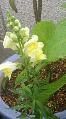 明け方、風雨が急に強まりましたが、このあとの天気予報を見ると一転晴れそうで一安心の5月4日みどりの日。キンギョソウがやっと開花しました。絵の具を溶かしたようなレモンイエローが奇麗です。ヤグルマソウの葉が去年のように巨大に成長しました。キキョウがおかげで隠れてしまいましたが、今日みたいに風雨の強い日は好都合かも。アジサイの花芽がいっこうに出てこないので不思議に思い、調べたところ衝撃の事実が明らかに。*********************************************************************************************************ガーデニング花図鑑:紫陽花(アジサイ)の花の育て方・剪定など剪定8月~10月に翌年の花芽が出来ますので、7月中に切り戻しを行います。花を2節ほど切り、落とします。花は切り花として飾りましょう。花が枯れていないので、切りにくいですが、そのままにしておくと秋に枯れた花を切った際に翌年の花芽まで落としてしまいます。 ●花芽は目視では分かりません。 ●アジサイは多少花がしぼんでも綺麗に見えるので切り落としづらいですが、7月中に剪定しないと駄目。 ●「色が変わるアジサイ」と銘打ったものがありますが、あれは萎んでいく過程で色が変わるだけです。そのまま鑑賞して、なんとなく秋以降に花を落とすと花芽も剪定してしまいます。 ●選定時期を逃したなら、いっそのこと剪定しないというのも手。 ●色が変わるアジサイは秋まで楽しんだら廃棄するくらいの気持ちが気楽。*********************************************************************************************************春先に調子に乗って枯れたと思い込んでた茎を思いきり切ってしまったのがどうやら原因のようです。今年は花はお預けみたいです。母の日用にあてにしてたのが外れてちょっと残念。
