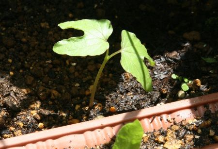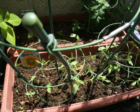 朝顔の双葉も出てきました。ツルを絡めるためのネットを購入。狭いベランダに目一杯植木鉢を置いている上、1.8mx2.7mと大き目のネットを欲張って購入したせいか、うまく収まらず2つ折にして設置しようとしましたが、やっぱりぐちゃぐちゃになってしまいました。まあ、朝顔がつかまれればいいやと思い、適当なところで完了。