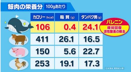 これはクジラの赤肉を和牛や豚肉、鶏肉と比較したものだが、カロリーは和牛の4分の一で、豚肉や鶏のモモよりも少なく、しかも脂肪もきわめて少ない。一方でたんぱく質は多く、コレステロールが少ない。そうした肉であるという。
