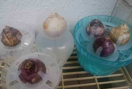 さて、うっとうしく続いた大雨がようやく上がり、気温もだいぶ低くなってきたので、冷蔵庫に入れておいたアイリス・ヒヤシンスの球根を取り出し、2019年水栽培の開始です。