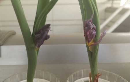 もう一つの種類のミニチューリップの蕾。しおれてるんだかどうか不明な感じです。うまく咲いてくれるといいです。