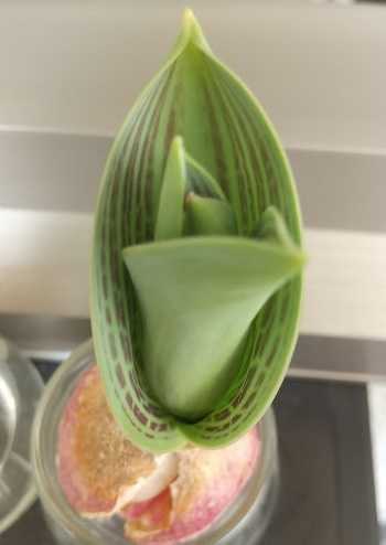 仲間はすでに咲いて散ってしまいましたが、元永沢君のミニチューリップも1cmも無い根でがんばって伸びてきました。葉の内側の黒い模様は他の同種にはない特徴です。