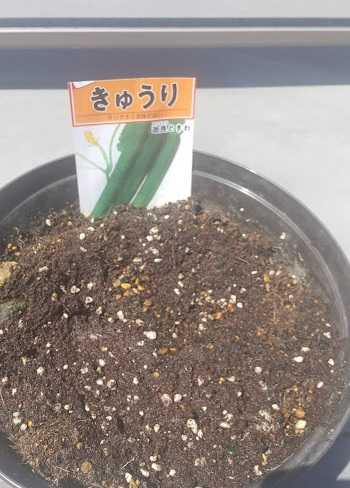 本当は直径30cmくらいの植木鉢が良いらしいのですが無いので、20cmっくらいのやつで。はたして無事ナス、キュウリの実がなるか?