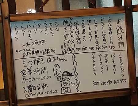 第1回は、JR新小岩駅から10分くらい歩いたもつ焼きはまちゃんというこじんまりしたお店です。夕方まで雨が降って寒い日曜の夜19:00頃でしたが、先に1人先客がいて楽しそうにお店の方と話してました。