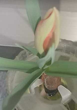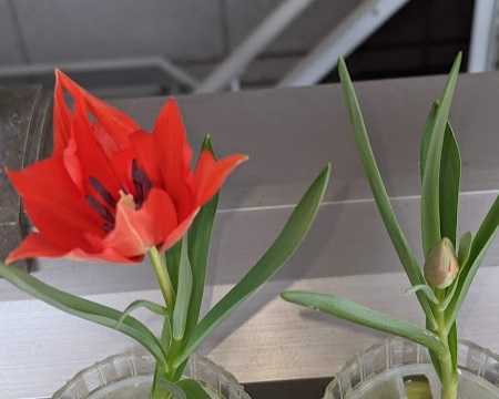 ミニチューリップ・リニフォリアの水栽培が開花しました。3つ買ったうち1つ咲いて、もう一つ咲きそうで、一つはダメでした。