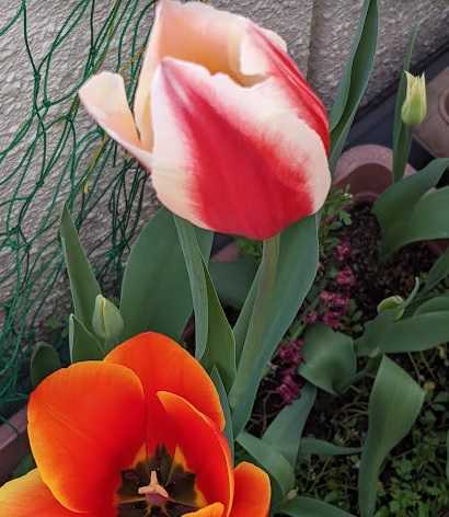 コンテナに植えたチューリップも次々に開花し、にぎわってます。
