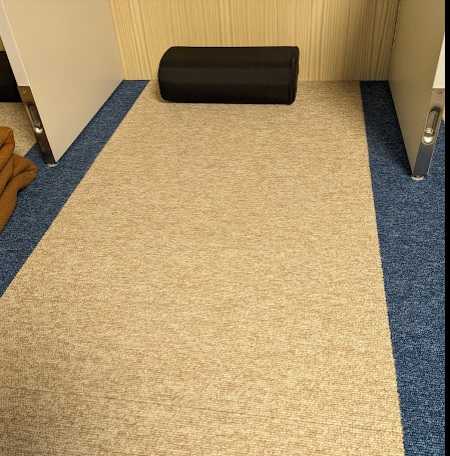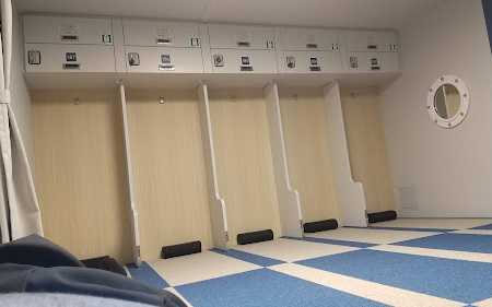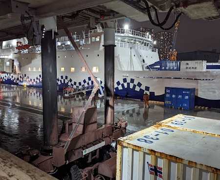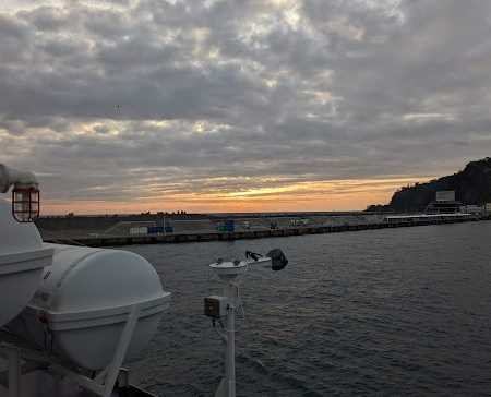 船室は2等の和室を選びました。昔のイメージだと、大広間に雑魚寝だったように思いますが、今回はTV付きの10人部屋でした。カーペットが敷いてあって、自分の陣地が色で明示されています。幅60cm×長さ150cmくらいでしょうか。荷物は頭上ロッカーに収納します。当日は幸いなことに3人しかおらず、私を除く2人はどこかに行ってしまい、貸し切り状態でした(ひょっとして私のいびきがうるさかったか?)。2等船内はWifiが入らず、NY市場を気にせず寝られました。毛布は1枚100円で借りられます。