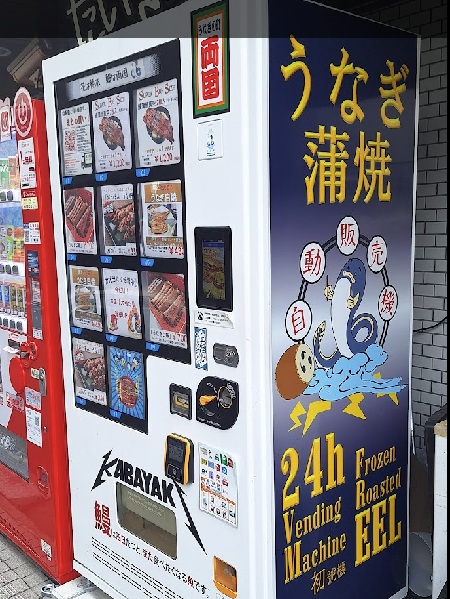 うなぎの自販機「ど冷えもん」と、うなぞうくん(蒲焼・うなぎご飯):墨田区両国