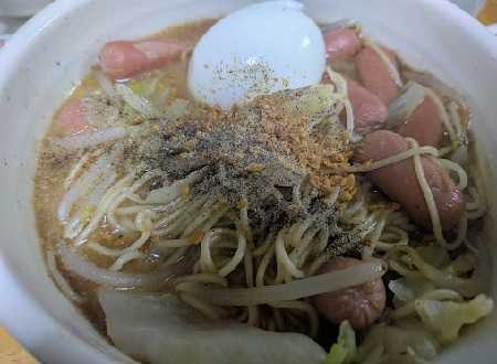 冷蔵庫にあったまいばすけっとで買ったカット野菜、ウインナ、野菜揚げ、ゆで卵を入れてできあがり。見た目があれですが、野菜の水分のせいか熊本ラーメンのスープの濃さが薄れ、そこそこおいしかったです。
