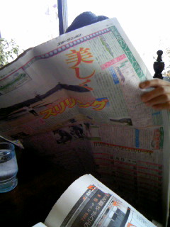 待ってる間、父さんが取ってきたスポーツ新聞を横取り!