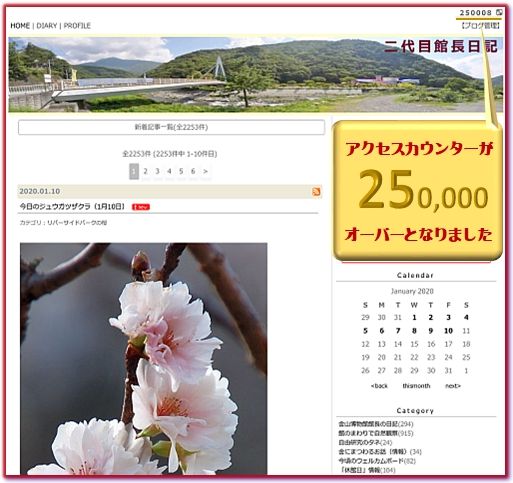 本日(1月10日)夜遅くに、このブログのアクセス状況を示すカウンターの数字が、25万を超えてきました。多くの皆さまにご覧をいただいているおかげです。 引き続き、これからもご愛読くださいますようお願い申し上げます。