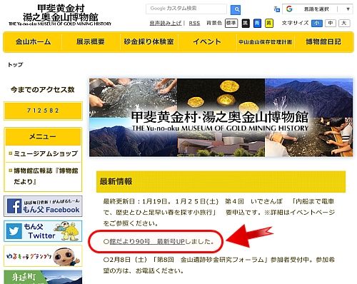 このほど、湯之奥金山博物館の広報誌『博物館だより』の第90号が刊行され、順次配布が始まっています。 先日、このブログでも紹介しましたが、湯之奥金山博物館ウェブサイトから、PDFによって見ていただくことも可能です。 上の写真の赤く囲んだ部分が、『博物館だより』のご案内ページへのリンクですが、今回の記事では画像そのものに、第90号への直接リンクが貼ってありますので、画像をワンクリックすると90号が表紙から開きます。 赤く囲んだお知らせの、すぐ上や、下のお知らせも、ぜひよろしくお願いいたします。