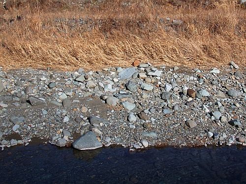 下部川の河原です。右岸側の岸辺には、晴れると暖かな日差しが注ぎ、向こうの草やぶの中から、野鳥のさえずりも聞こえてきます。春近し・・・。 今日は1月15日。水曜日です。湯之奥金山博物館は、「休館」となります。明日の木曜日からのご利用をお願い申し上げます。