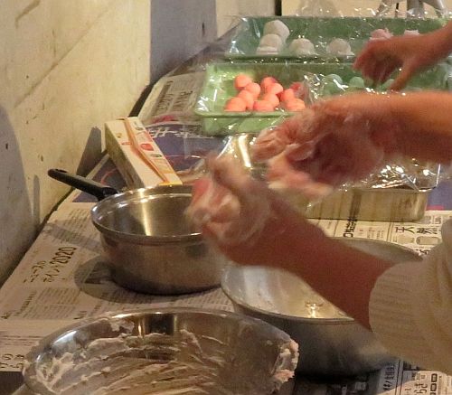 お団子づくり始まりました。米粉を練って、赤色○号とか青色□号とかで色づけして、丸めてぇ~。 今年の団子はこんな感じ。出来上がり? いえ、まだまだ、蒸さなきゃ・・・。 色ごとに蒸していきます。 そして飾り付け。 下から見上げたところ。いい感じ。