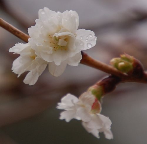 今日は、夜半から雪という予報でしたが、実際には雨でした。予報では、午後には晴れ間も出てくるようなことでしたが、それも予報に反し、終日雨となりました。下部リバーサイドパークのジュウガツザクラにも、冬の雨が降りかかっていました。 雨粒をたたえたジュウガツザクラの花も、おつかな・・・。 天気がよくないときは、こんな風にしっとり撮れます。