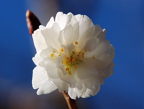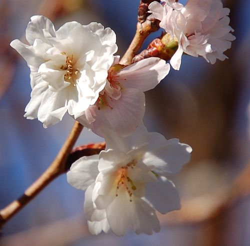 今日は、よく晴れて、青空がきれいでした。下部リバーサイドパークのジュウガツザクラの木にも陽がよく当たり、花の色に冴えが感じられました。 こちらの花は、1点目のものよりもやあ充実した(咲いて日数が経った)ジュウガツザクラの花です。 今日で1月も終わりですが、寒い中でも、とてもよく咲いてくれていました。