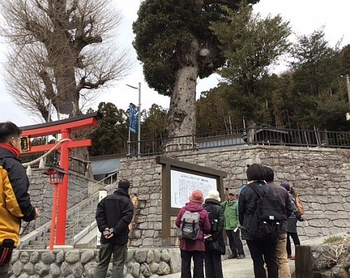 内船の駅舎を背後に見る、駅前の一角で、山梨県内で一番早く咲くサクラを見学しました。 カンザクラの1種とされているものですが、いつもは2月の初めに咲き出すのに、今年はもう、満開に近い感じ。暖かなのかな、いつもの年に比べて・・・。 駅前を過ぎて、内船八幡神社に向かう途中、お店の店先、ここにも春が・・・という雰囲気がただよっていました。 「いでさんぽ」当日は、曇り空でしたので、1月5日の下見の時の画像でご紹介しますが、内船八幡神社の入り口には、石段の上の左右にみごとな記念木があります。向かって右手は、大きなクスノキ。そして左手のは、すっかり落葉しているイチョウです。「あそこに、八幡さんがあるよ」って、遠くからでもすぐわかるランドマークになっています。 八幡神社の境内には、ほかにもいろいろな樹木などがありますが、中でも目をひいたのは、モクレンの若木。綿に包まれたようなつぼみがいっぱい。注意して見ると、何じゃこれ、って感じで、モクレンの花の開きそうなヤツもあったのです(これも、1月5日の下見の際の撮影)。 次に訪れた内船寺さんの境内。開基の四条金吾さんご夫妻のお墓にお参りした際に見たものですが、スイセンの花がいっぱいに咲いていました。あたりには花の香りがけっこう強くただよっていました。 なお、スイセンは、この内船寺の境内ばかりでなく、内船地域のそこここに、もう春といわんばかりに咲いています。 内船寺さんの境内で、またまた驚きがありました。それがこれ。どう見てもシキミです。シキミは、仏事に用いるため寺院にはよく見られる常緑樹だそうですが、その花の時期は3~4月とされています。 なので、なぜ、いま咲いているんだろう、って思ったしだいです。やはり特別に暖かいのかなあ、ここは・・・。 そこで、後になって思ったのですが、山梨あたりと比べ穏やかな気候の鎌倉に、かなり近い、温暖な内船の地は、頼基さん(四条金吾さんの本来のお名前)には居心地がよかったのかもしれません。 暖かいといえば、内船周辺には、茶畑が広がっていて、「甲斐のみどり」などで知られる南部茶の生産が盛んです。今回のご参加の皆さまも、そういったところにも目を向けられ、おさんぽ楽しんでいただけました。(初期投稿:1月26日11時20分 加筆投稿:1月27日13時4分)