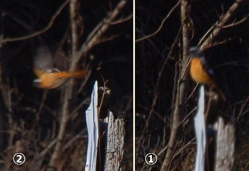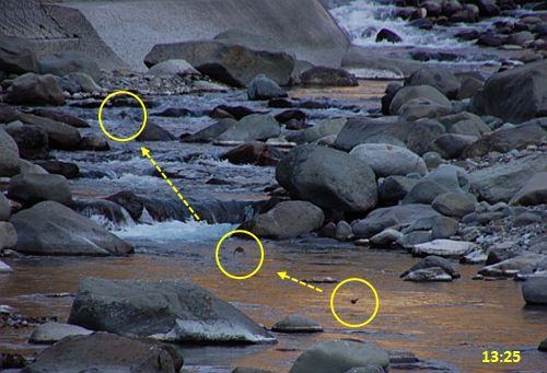下部川のカワガラスについての1月6日の観察記録です。 まず、お昼過ぎに、1羽のカワガラスが上流に向かって飛んでいく姿を見ました。それから1秒もたたない時間差で、下流側を見ますと・・・。 今度は、2羽のカワガラスが並んで飛んで、川の流れの中の石の上にとまる姿をとらえることができました。そのようす、8カットの連続写真でご覧ください(↑)。この時の記録によって、少なくとも3羽のカワガラスが生息していることが確認できたのではないかと思われるのでした。《追記メモ》 この記事の初回投稿(2020年1月7日23時49分)において、2点目の画像に不備があり、修正したものに差し替えを行いました。2020年1月8日10時45分