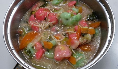 小正月の賑わいを演出した団子花につかわれたカラフルなお団子、固くなったのをもどし、おいしくお団子汁になりました。小正月は、まだお腹の中で続いているようです。