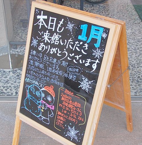 1月6日(月) 平日として最初の開館。ちょっぴり通常の落ち着いた雰囲気。まだ松の内で、門松がならんでいます。明日は七草。だから見納めかな。 そんな門松の隣に出ていた今日のウェルカムボード。大きな文字で「睦月」とありますね。1月の旧称。よい言葉の響きを感じます。